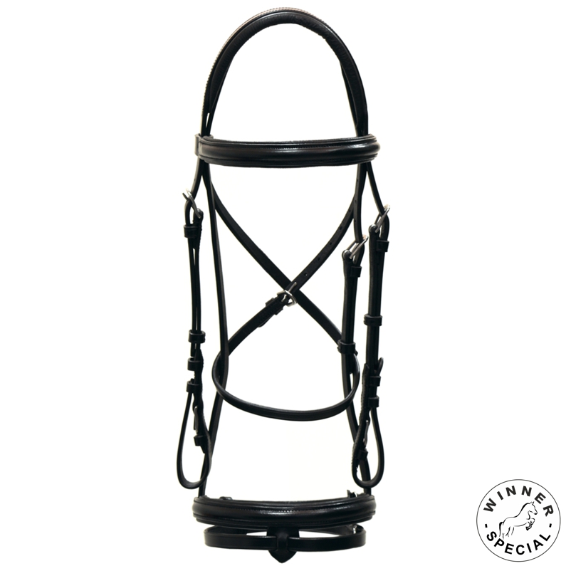 Briglia Winner SPECIAL in cuoio di buona qualità completa di redini ricoperte in gomma e fibbieria in acciaio inox. Nasalina e frontalino in cuoio bombè, foderati ed imbottiti.