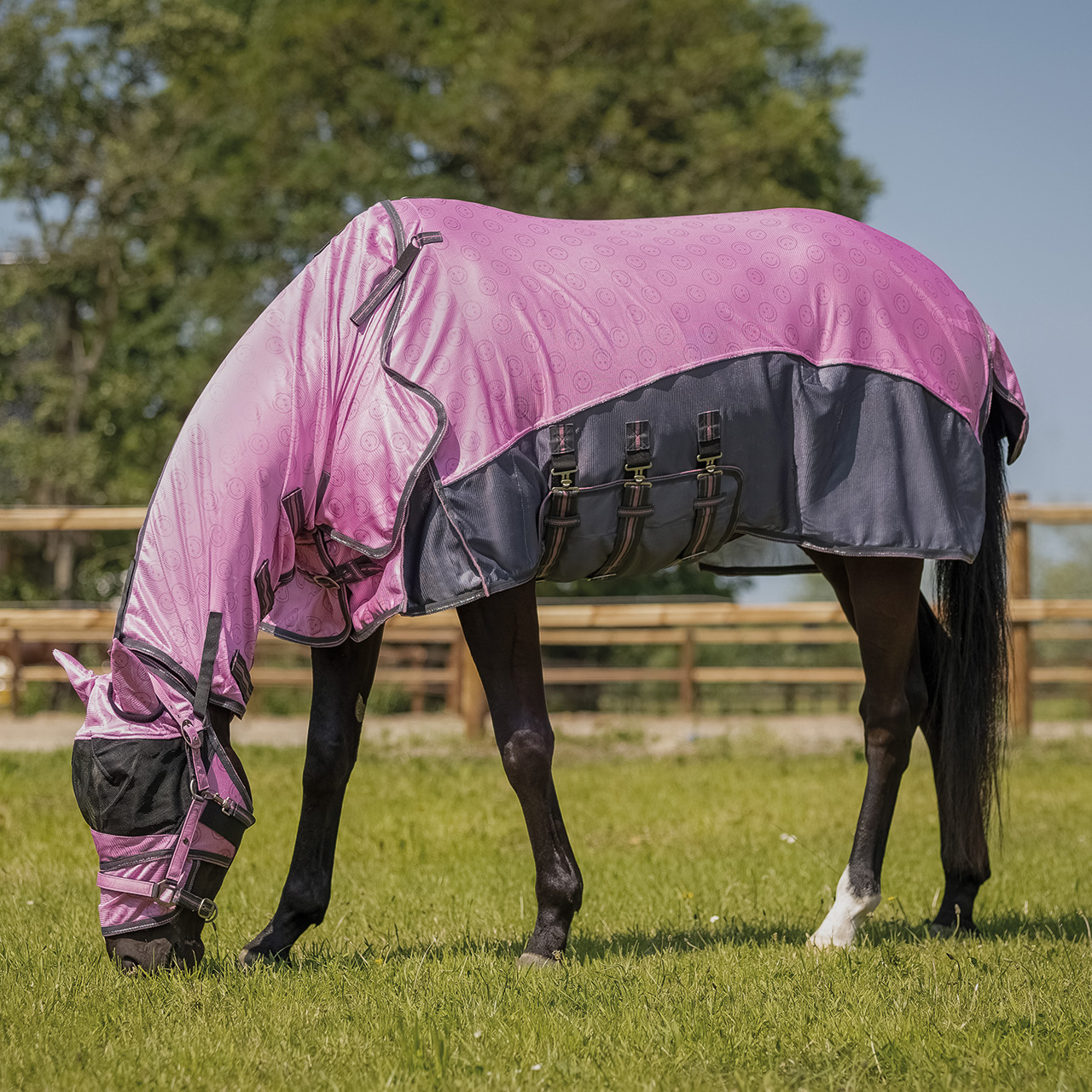 Coperta antimosche a maglia fine, decorata con faccine sorridenti Copricollo e maschera antimosche staccabili, fissabili alla coperta con chiusure a strappo La maschera antimosche è realizzata in rete resistente con cuciture per evitare il contatto con gli occhi Rivestita internamente con tessuto liscio nella parte anteriore e nella parte superiore del collo per ridurre il rischio di sfregamenti Parte inferiore con tre chiusure a strappo con estremità elasticizzate Doppia chiusura con fibbia sul davanti