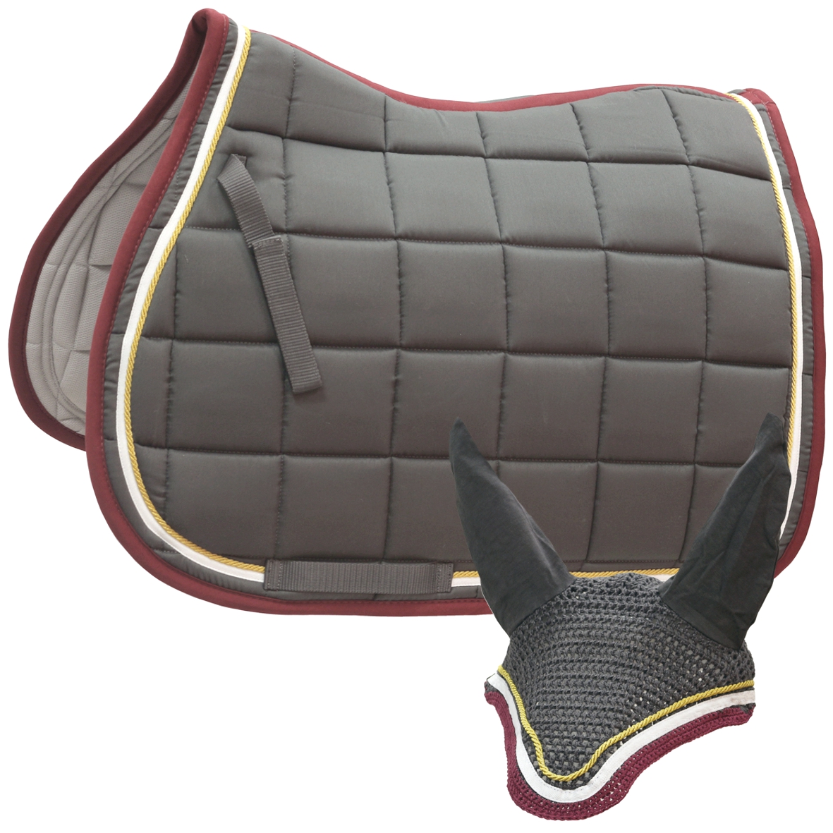 Sottosella con cuffia abbinata, doppia imbottitura con cordone e fettuccia, trapuntatura a quadri.
