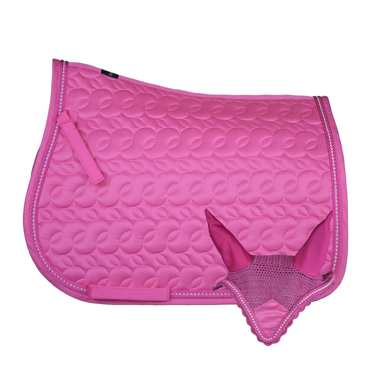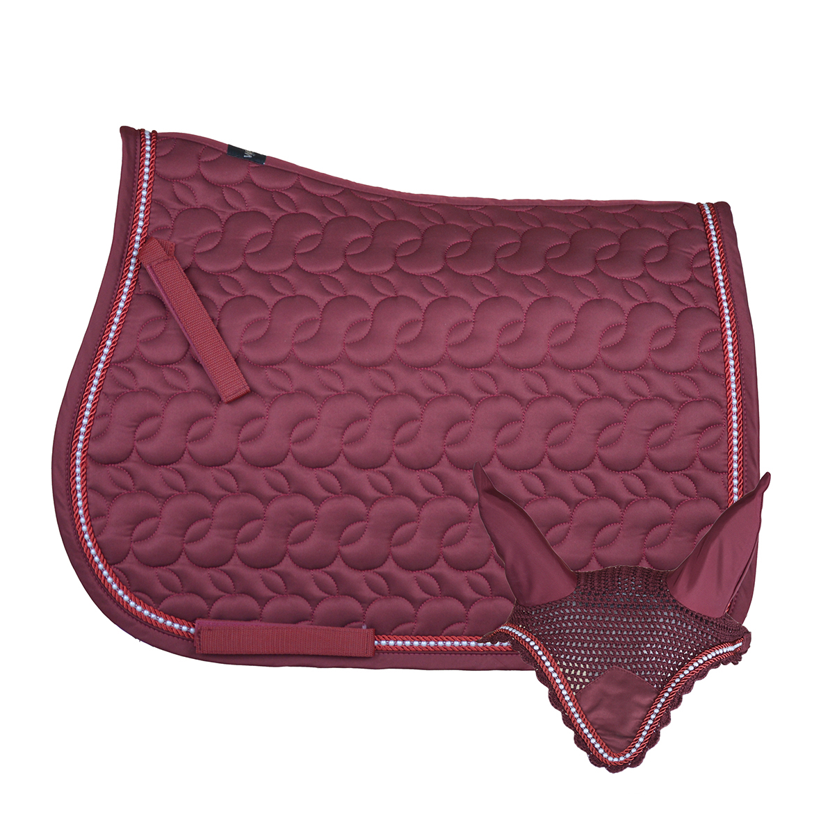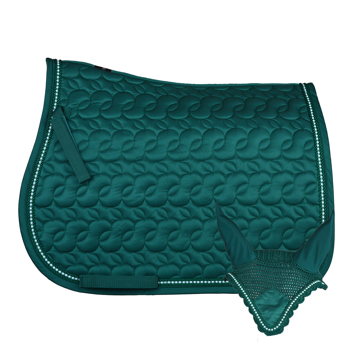 Il sottosella si caratterizza per il morbido satin, la particolare trapuntatura ad intreccio e l’elegante cordone di perle bianche. Viene venduto con cuffietta abbinata con orecchie elasticizzate di lycra.