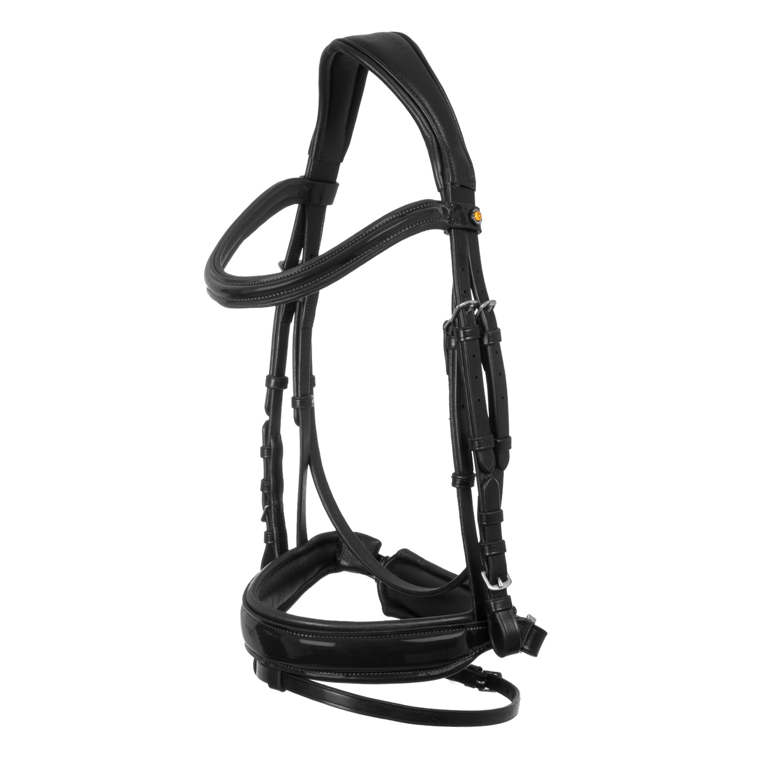 Testiera inglese realizzata con pregiato cuoio morbido, caratterizzata da fibbie in acciaio inossidabile che assicurano durabilità e stabilità nel tempo.