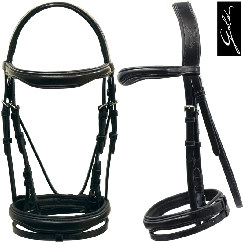BRIGLIA GOLD ANATOMICA in cuoio Italiano con frontalino nasalina e sopratesta imbottiti e foderati con morbida pelle. Fibbieria in acciaio inox, completa di chiudibocca.